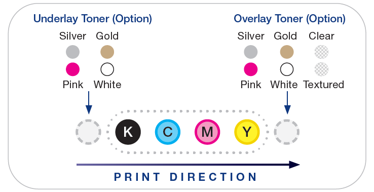 • Specialty toner can be layered together or combined with CMYK to create stunning spot colors and metallic effects.