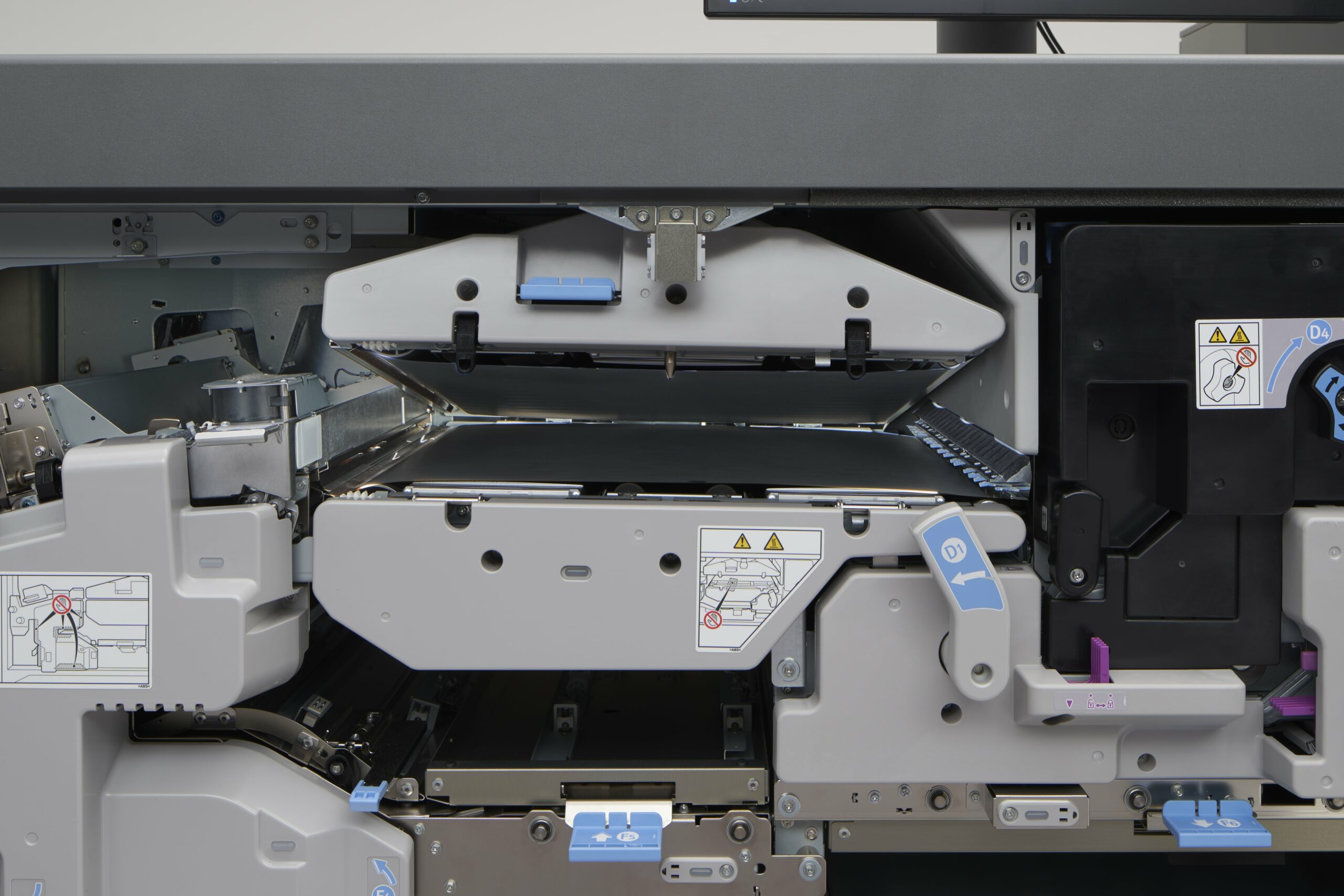 A 5,000 sheet stacker with a rollaway cart quickly moves large output volumes to offline binding or packing and shipping.